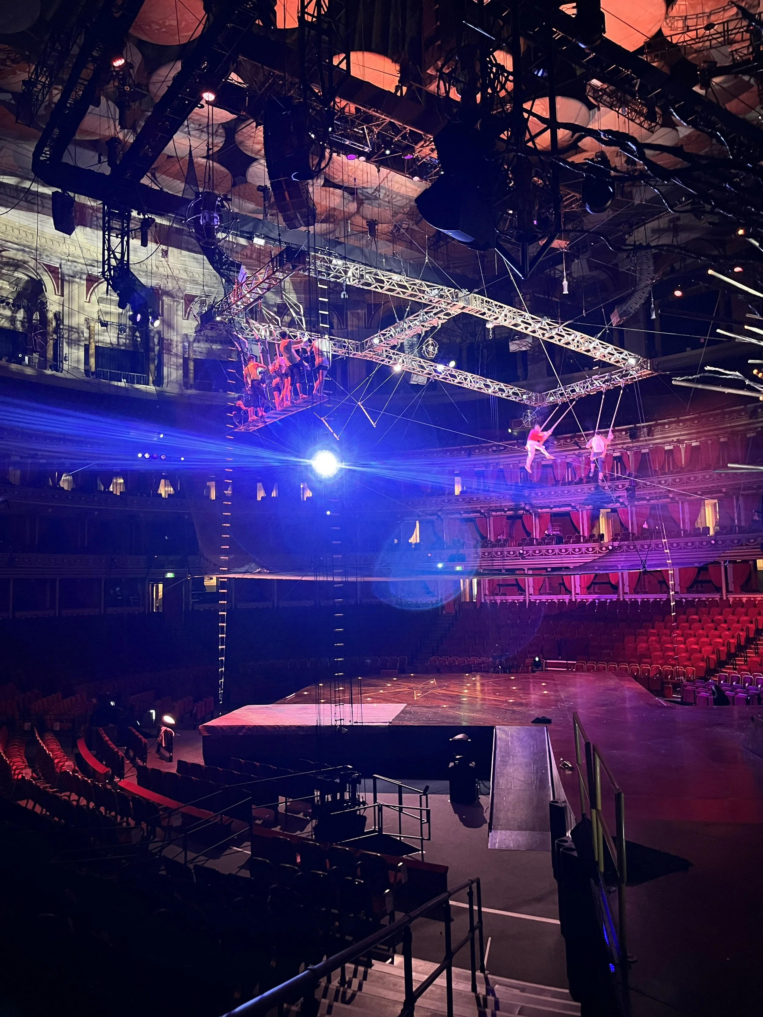 The sight that met me as I stepped into the auditorium took my breath away; firstly, the vast grandeur of an empty Royal Albert Hall is a sight to behold, and at it’s a centre, a troupe of around 12 trapeze artists were soaring through the air, suspended at a vertigo-inducing 10m above the stage.